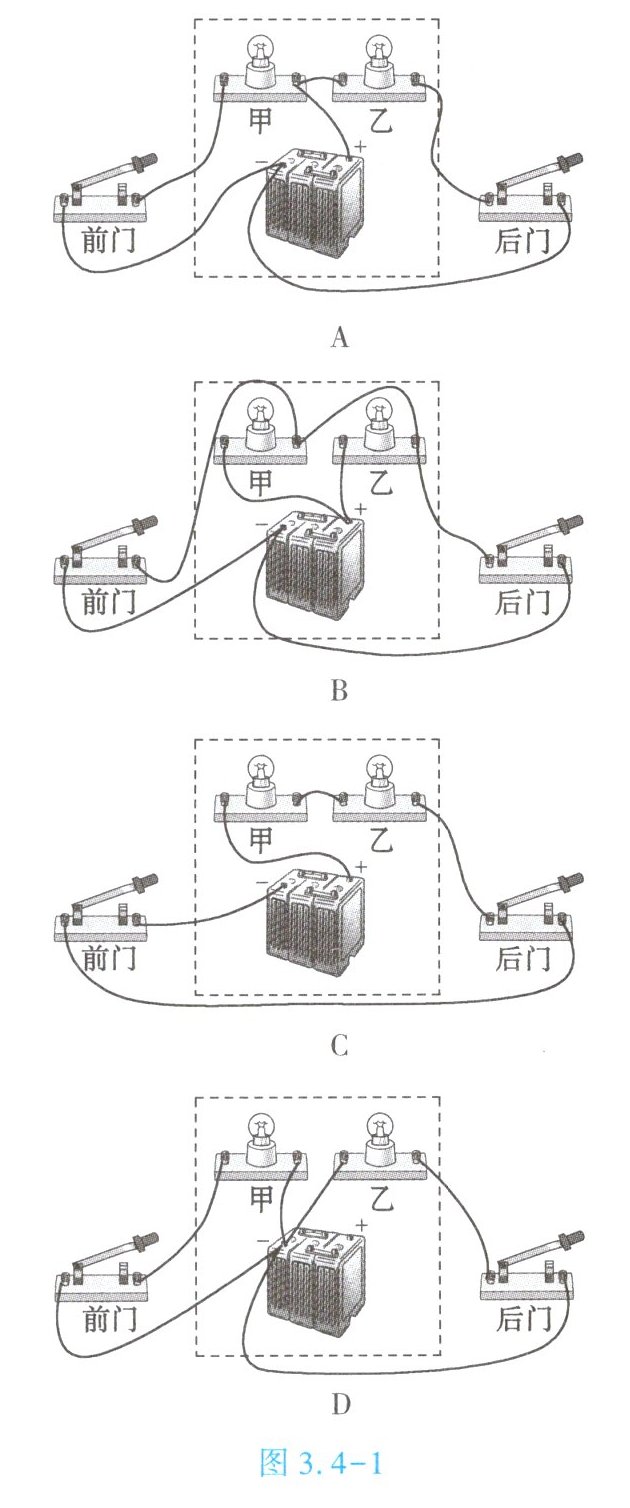 6. (★★)学校有前、后两个门,在前、后门各装一个按钮开关,学校传达室有电池组和甲、乙两盏灯。要求:前门来人按下开关时甲灯亮,后门来人按下开关时乙灯亮,图 3.4 - 1 所示的电路中符合要求的是【