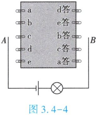 2. (★★)如图 3.4 - 4 所示是一个同学制作的“回答问题正确”显示器。在一块长方形硬纸板上,别上两排曲别针。左排曲别针表示问题,一个曲别针旁写一个问题;右排曲别针表示相应的答案,一个曲别针旁写一个答案。把干电池和小灯泡连接起来,并留出两个接线头 A 和 B,提问者把接线头 A 与左排的一个曲别针接触,表示提出一个问题,要求回答者把接线头 B 与右排的一个曲别针接触,表示选出一个答案。它是利用电路的
