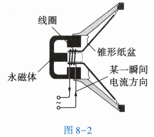 2. 当扬声器中的线圈通过的电流方向如图8-2所示时,线圈向左运动,那么当电流方向改变时,线圈将向