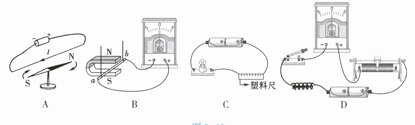 9. 如图8-9所示,风速计是由风叶和改装的电流表构成的。风速越大,风叶转动越快,电流表的示数也越大。图8-10中与这一过程的工作原理相同的是 【