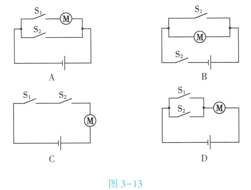 13. (★★)喜爱物理的小明想设计一个双钥匙电动安全锁,这里钥匙相当于“开关”,要求两把钥匙同时使用(开关闭合)才能开锁,图3-13中符合设计要求的电路图是【