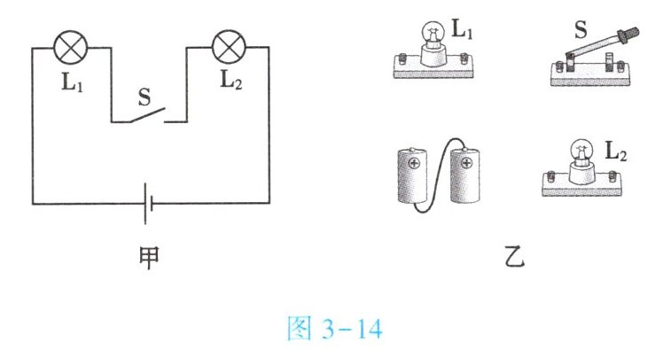 14. (★★)用笔画线表示导线,按照图3-14甲所示的电路图,将图3-14乙中各元件连接起来。(导线不允许交叉)