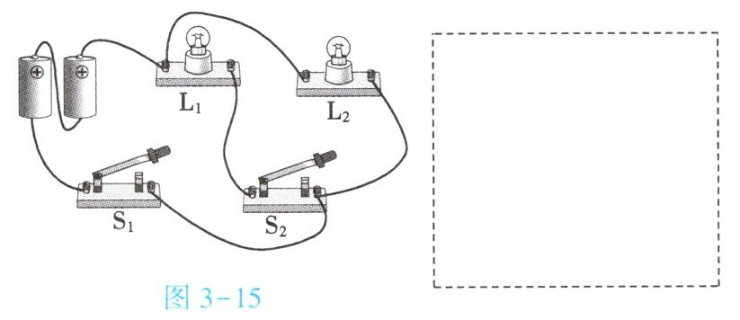 15. (★★)请根据图3-15所示的实物电路,在虚线框内画出正确的电路图(要求:标出$S_1、$$S_2、$$L_1、$$L_2)。$