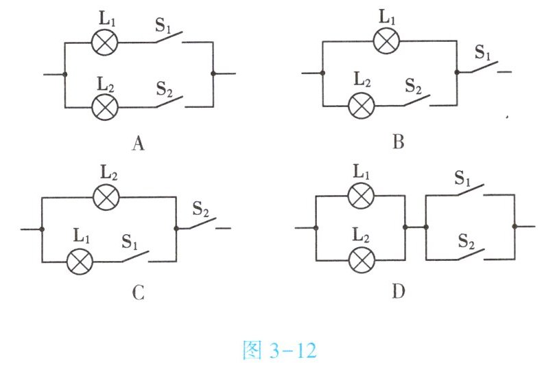12. (★★★)老师给小龙一个密封盒,其表面可见两个开关$S_1、$$S_2$和两盏灯$L_1、$$L_2。$为了探究开关和灯在密封盒内是如何连接的,小龙进行了如下操作:先闭合$S_1,$只有灯$L_1$发光;又闭合$S_2,$两灯都发光;再断开$S_1,$两灯都熄灭。图3-12中符合上述操作结果的连接方式是【