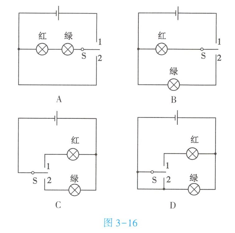 16. (★★)(2025·广州)出租车驾驶室内设计了控制电路来显示是否载有乘客,车顶指示灯显示红色时载有乘客,显示绿色时未载乘客。如图3-16所示的电路图中,通过开关S接“1”或“2”可以符合上述设计要求的是【