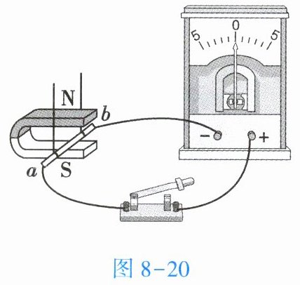 21. 如图8-20所示是“探究导体在磁场中运动时产生感应电流的条件”的实验装置,闭合开关后,导体ab、灵敏电流计、开关组成闭合电路。小明将实验中观察到的现象记录在下表中。