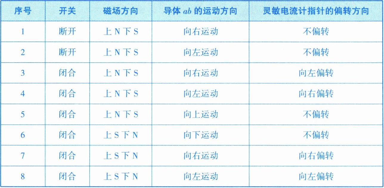 |序号|开关|磁场方向|导体ab的运动方向|灵敏电流计指针的偏转方向|