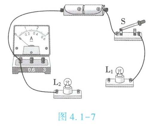 7. (★★)如图 4.1 - 7 所示是未完成连接的实物电路,请用笔画线代替导线完成该电路的连接。要求:两灯并联,开关 S 在干路上,电流表只测量通过灯泡$ L_1 $的电流(电流大约为 0.3 A),导线不能交叉。