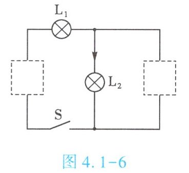 6. (★★★)如图 4.1 - 6 所示,根据电路图中所标出的电流方向,在图中的两个虚线框内分别填上一个电源或一个电流表的符号。要求:①使电路中实际的电流方向和图中所标出的电流方向一致;②符合电流表的使用要求。