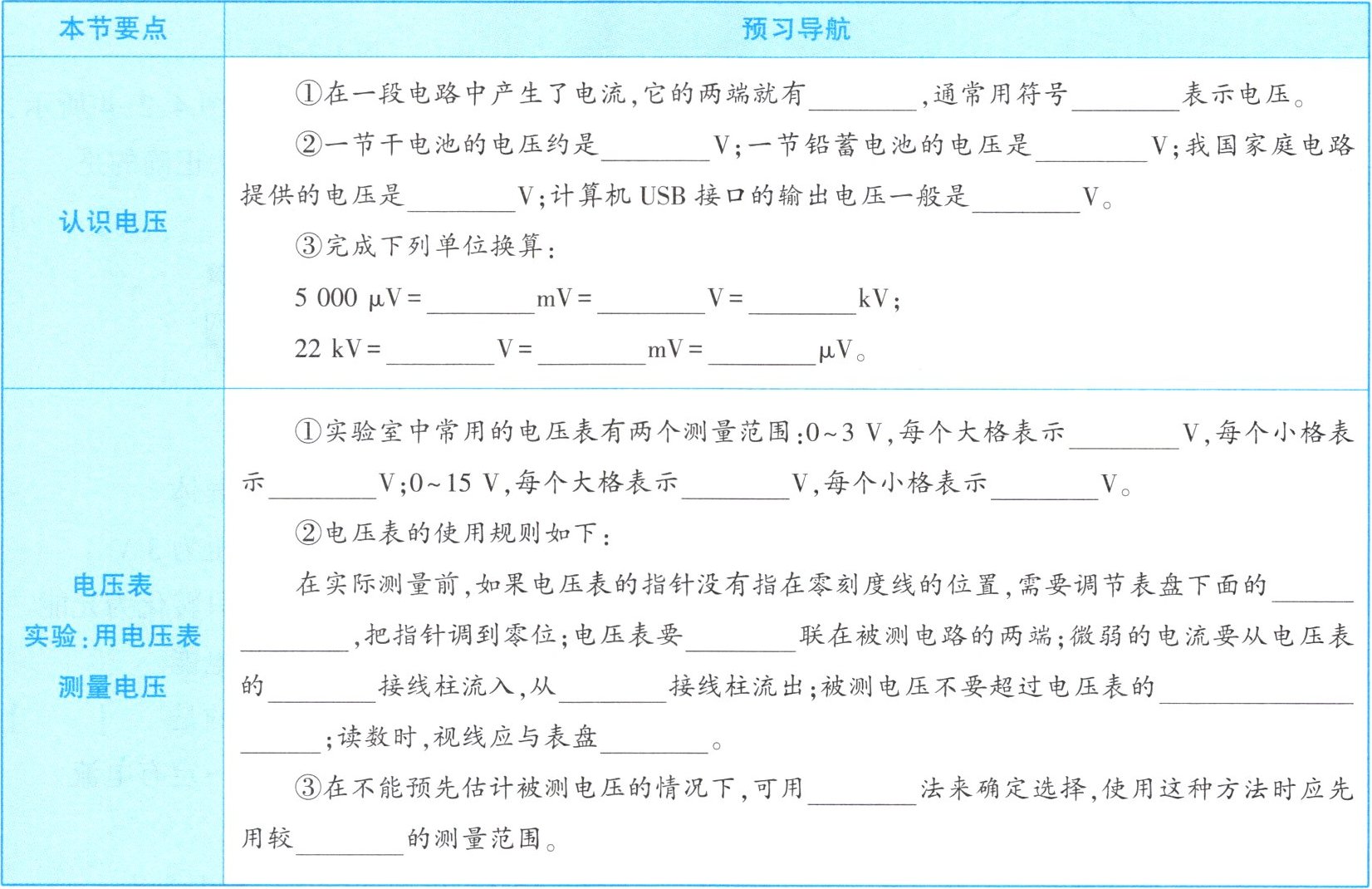 认识电压:①电压;U;②1.5;2;220;5;③5;0.005;5×10⁻⁶;2.2×10⁴;2.2×10⁷;2.2×10¹⁰。