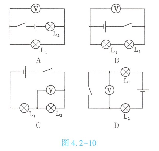 10. (★★)如图 4.2 - 10 所示的电路图中,闭合开关后,电压表能测灯泡$ L_1 $两端电压的是【