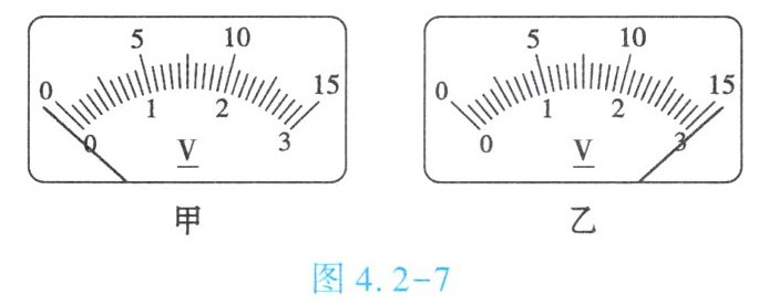 ;纠正后第二次把电压表接入电路时,指针偏转情况如图 4.2 - 7 乙所示,这是因为所选量程太小