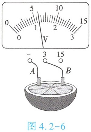 6. (★★)将 A、B 两个金属片插入柠檬制成“水果电池”,用电压表测量水果电池的电压,如图 4.2 - 6 所示。该电池的正极是