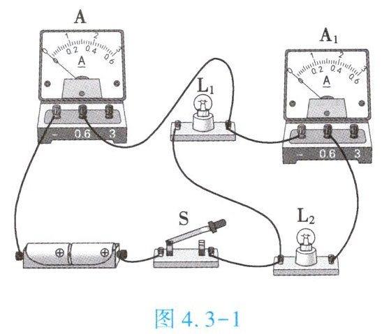 2. (★★)如图 4.3 - 1 所示的电路中,闭合开关 S 后,电流表 A 的示数为 0.4 A,电流表$ A_1 $的示数为 0.3 A,则通过小灯泡$ L_1、$$L_2 $的电流分别为【