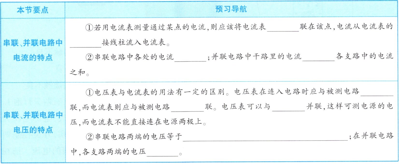 各支路中的电流之和。||串联、并联电路中电压的特点|①电压表与电流表的用法有一定的区别。电压表在连入电路时应与被测电路