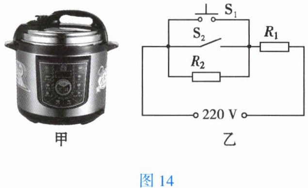21. 如图 14 甲所示是内胆为铝质材料的电饭锅,其内部电路如图 14 乙所示$,R_1 $是加热电阻,阻值为 48.4 Ω;$R_2 $是限流电阻,阻值为 484 Ω。煮饭时,接通电源(220 V 50 Hz),闭合手动开关$ S_1,$电饭锅处在加热状态。当锅内食物温度达到 103 ℃时,开关$ S_1 $会自动断开,断开后若无外力作用则不会自动闭合;$S_2 $是一个自动温控开关,当锅内食物温度达到 80 ℃时会自动断开,温度低于 70 ℃时会自动闭合。[水的比热容为$ 4.2×10^3 J/(kg·℃),$铝的熔点为 660 ℃]
