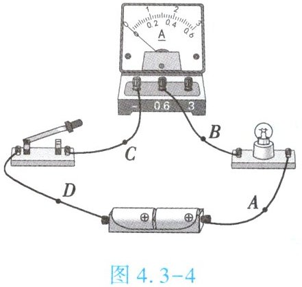 6. (★★)在做电学实验时,有时会遇到电路元件接触不良的现象,一般要利用电压表来检测故障发生的位置。小强同学连接了如图 4.3 - 4 所示的电路,开关闭合后灯泡不亮,电流表的示数为零,此时用电压表测得 A、D 间的电压不为零,A、C 间的电压为零,C、D 间的电压不为零,这说明【