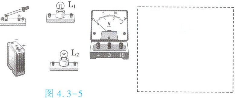 7. (★★)如图 4.3 - 5 所示,有两只灯泡$ L_1 $和$ L_2,$还有电池、开关和电压表,电源电压为 2 V。现要求灯泡$ L_1 $和$ L_2 $并联,开关控制两灯,并用电压表测量灯$ L_2 $两端的电压。请在虚线框内画出对应的电路图,并将图 4.3 - 5 中的电路元件连接起来。