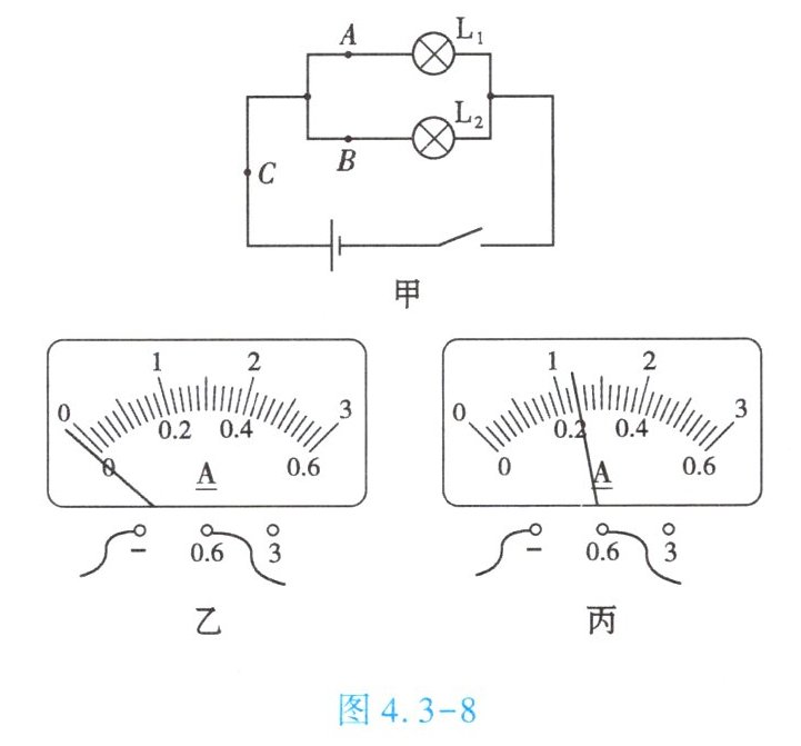 点。(2)小明同学在测量 A 处的电流时,闭合开关前,发现电流表指针的位置如图 4.3 - 8 乙所示,原因是
