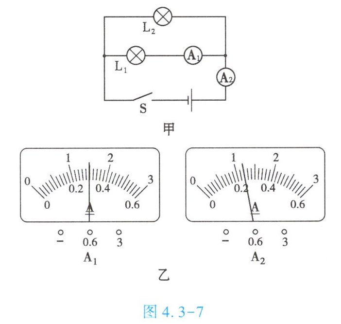 2. (★★)如图 4.3 - 7 甲所示的电路图中,当开关 S 闭合后,电流表的示数如图 4.3 - 7 乙所示,其中电流表$ A_1 $测量通过灯泡_________(填$“L_1”$或$“L_2”)$的电流,电流表$ A_2 $的示数为_________A,通过灯泡$ L_2 $的电流为_________A。