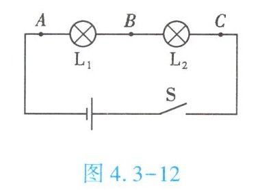 7. (★★)如图 4.3 - 12 所示,在“探究串联电路中电压的特点”的实验中,小明同学用电压表测出 A 与 B、B 与 C、A 与 C 之间的电压分别为 $U_{AB}= 1.5$ V,$U_{BC}= 1.5$ V,$U_{AC}= 3$ V,在表格中记录数据后,下一步应该做的是【