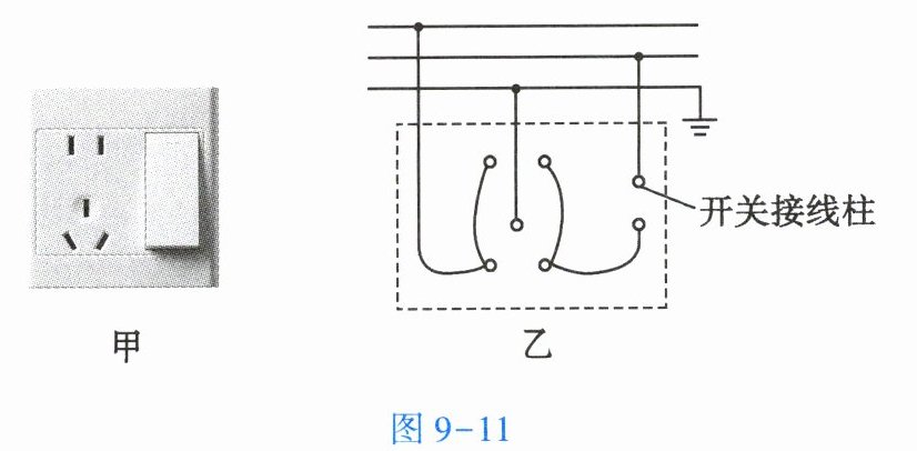 也过大。(2)观察厨房中的电器时,妈妈告诉他,以前电饭锅不用时要将插头从插座上拔下来,既不方便也容易损坏插座。后来电工师傅换了一个如图9-11甲所示的带开关的插座后,只要拨动下开关就可以断电了。小明仔细观察了如图9-11甲所示的插座后,很快就在纸上画出了如图9-11乙所示的插座背面接线示意图。图9-11乙中,最上面的一根线应该是