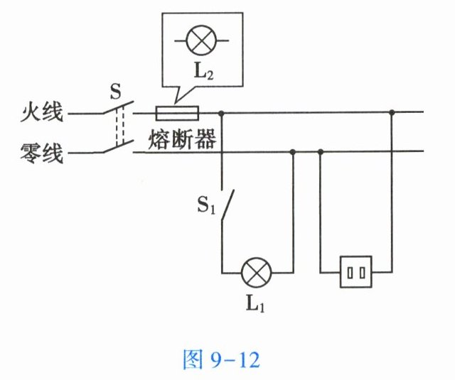 18. 如图9-12所示是小雷设计的部分家庭电路示意图,他与爸爸共同按图进行布线安装。完成连接后,两人同时闭合总开关S及开关$S_1$时,灯泡$L_1$闪一下便熄灭,家中所有用电器停止工作。为确定发生故障的元件进行了如下的探究。