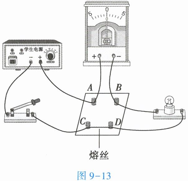 (1)在图9-13中,C、D间接上一段熔丝,A、B间接入灵敏电流计,其他部分按如图所示连接好电路。