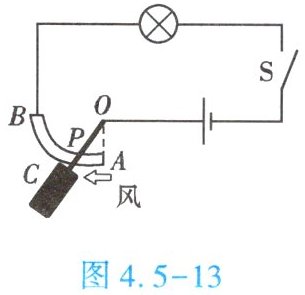9. (★★★)一位同学设计了一个风力测定仪,如图 4.5 - 13 所示,O 为转动轴,OC 是金属杆,下面连接着一块受风板。无风时,OC 是竖直的,风越强,OC 杆偏转的角度越大。AB 是一段圆弧形电阻,P 点是金属杆与圆弧形电阻相接触的点,电路中接有一个小灯泡。测风力时,闭合开关 S,通过分析可知,金属杆 OC 与圆弧形电阻 AB 组合在一起相当于一个