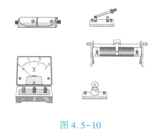 6. (★★)请用笔画线代替导线,将如图 4.5 - 10 所示的元件连接成电路。要求:电压表测量灯泡两端的电压,当滑动变阻器的滑片向左移动时,灯泡变亮。