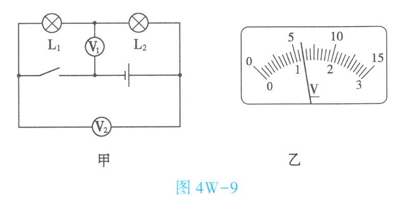 9. (★★★)如图4W-9甲所示,当闭合开关后,两个电压表指针偏转均如图4W-9乙所示,则灯泡$L_1$和$L_2$两端的电压分别为【