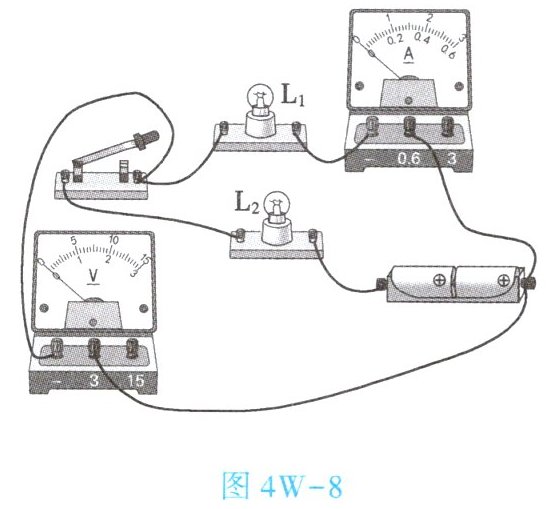 8. (★★)小明同学用两节新干电池、两只灯泡、电流表、电压表、开关等连接成如图4W-8所示的电路。闭合开关进行实验,下列判断正确的是【