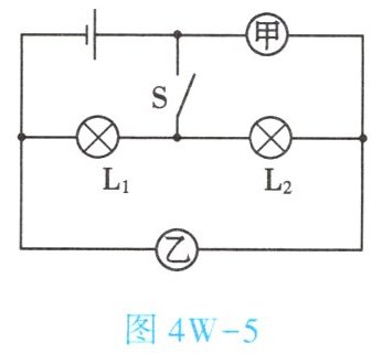 5. (★★★)如图4W-5所示的电路图中,当开关S闭合后,若灯泡$L_1、$$L_2$并联且能正常发光,则甲表是