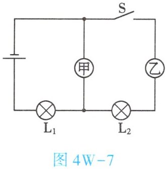 7. (★★)如图4W-7所示,闭合开关S后,若两灯均能发光,则【