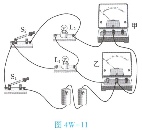 11. (★★★)如图4W-11所示,实物电路由电源,开关$S_1、$$S_2,$两只小灯泡$L_1、$$L_2,$甲、乙两个电表(电流表或电压表)组成。下列根据现象对甲、乙两个电表的判断,正确的是【
