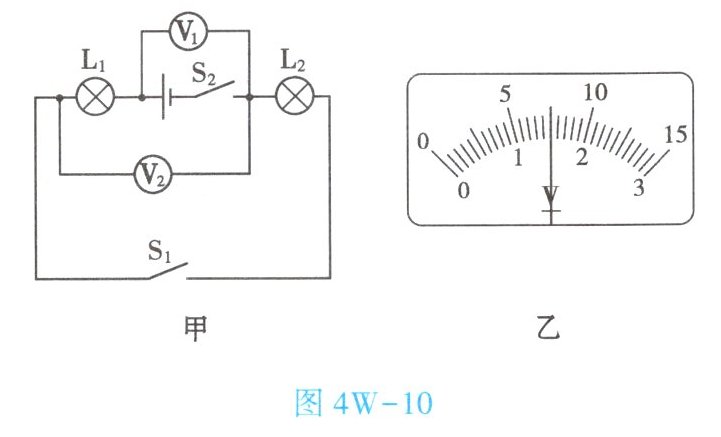 10. (★★★)如图4W-10甲所示的电路图中,当闭合开关$S_1$和$S_2$后,两个电压表的指针偏转均如图4W-10乙所示,则灯泡$L_1$和$L_2$两端的电压分别为