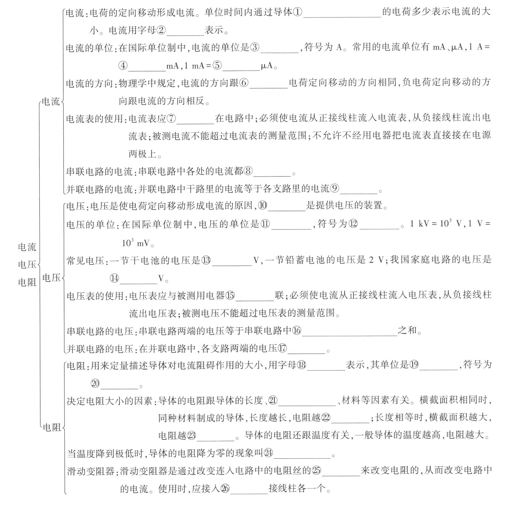 ①横截面;②I;③安培;④1000;⑤1000;⑥正;⑦串联;⑧相等;⑨之和;⑩电源;⑪伏特;⑫V;⑬1.5;⑭220;⑮并;⑯各部分电路两端电压;⑰相等;⑱R;⑲欧姆;⑳Ω;㉑横截面积;㉒大;㉓小;㉔超导现象;㉕长度;㉖一上一下
