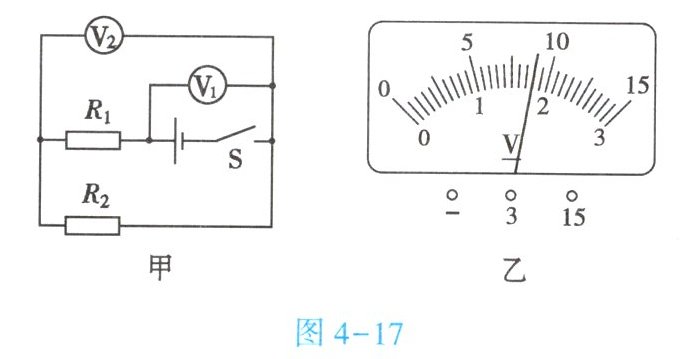 联。当闭合开关S后,两个电压表指针的偏转情况均如图4 - 17乙所示,则电阻$R_1$和$R_2$两端的电压分别为8