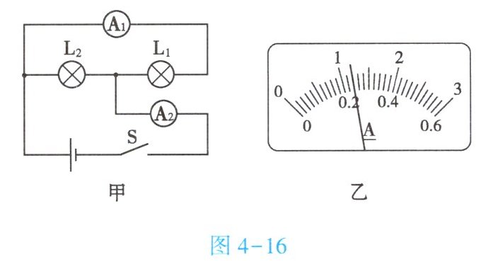 10. (★★)在如图4 - 16甲所示的电路图中,当闭合开关后,两个电流表的指针偏转情况均如图4 - 16乙所示,则灯泡$L_1$和$L_2$中的电流分别为【
