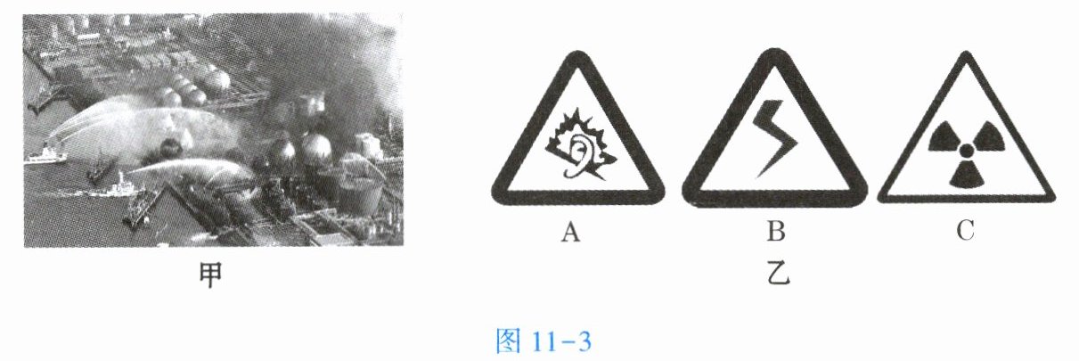 (2)一系列的爆炸,使得大量的核燃料外泄,周围的人们处在核污染中。图 11-3 乙中是核辐射标识的是(