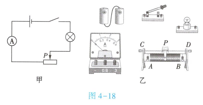 (2) 若实验中电流不超过0.6 A,请用笔画线代替导线将图4 - 18乙所示的实物电路连接起来。