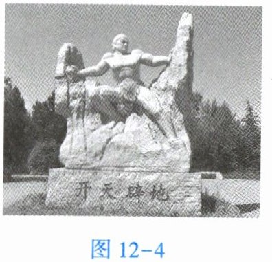 15. 在我国古代神话传说中,“盘古开天辟地”的故事深刻地反映了古人对宇宙起源的丰富想象与神秘理解。如图12-4所示,该雕塑生动地展现了盘古开天辟地的场景。这一故事不仅构成了中国文化中一个重要的神话元素,而且代表了人类早期对宇宙起源及其形成过程的一种独特诠释。而现代科学则通过各种先进的观测技术和理论模型,逐步揭示了宇宙的奥秘,这些科学探索不仅为我们提供了关于宇宙的精确知识,也不断挑战和扩展了我们对宇宙的认知边界。