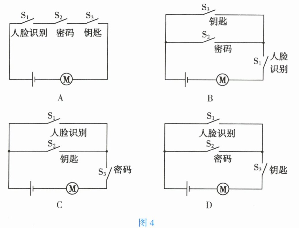 9. (2024·湖南)科技小组模拟“智能开锁”设计的电路图,有两种开锁方式,即“人脸识别”与输入“密码”匹配成功或“人脸识别”与使用“钥匙”匹配成功才可开锁。现用$S_{1}$表示人脸识别,$S_{2}$、$S_{3}$表示密码、钥匙。匹配成功后对应开关自动闭合,电动机才工作开锁。图4中满足上述两种方式都能开锁的电路图是【