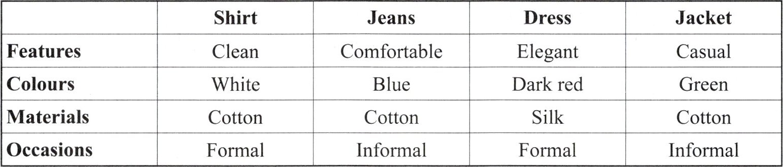 ) 1. Which kind of clothes has the feature of “elegant”?A. The shirt. B. The jeans. C. The dress. D. The jacket.