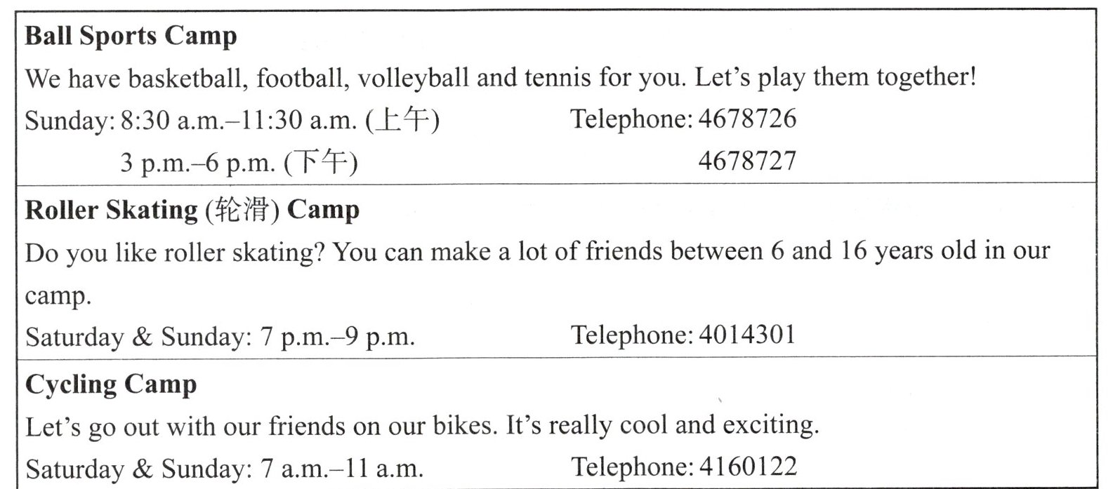 ) 3. If you want to know more about the Cycling Camp, you can call it on ______.A. 4160122 B. 4678726 C. 4014301 D. 4678727