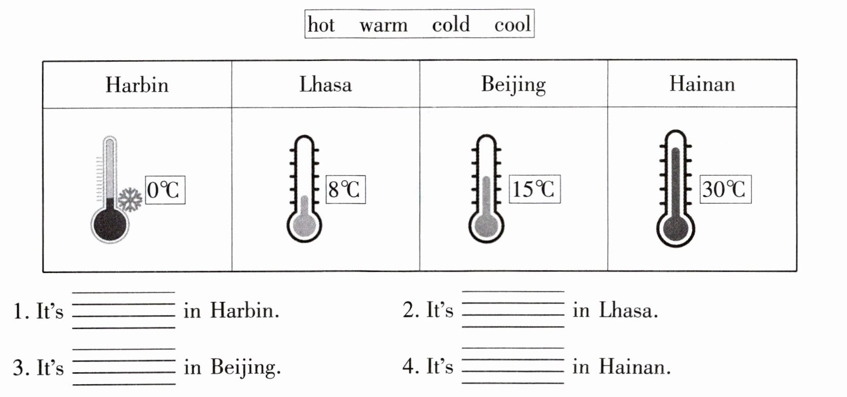 三、Look and write. Linlin 记录了几个城市的天气情况。请根据图片提示,选出合适的单词填入四线三格内完成句子。