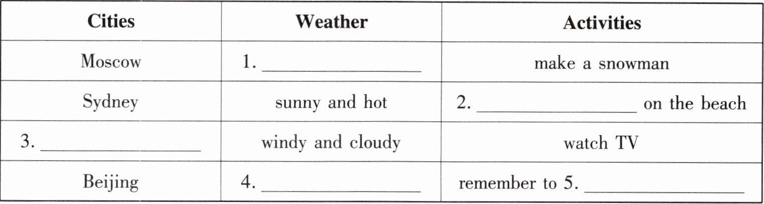 Hello, everyone! This is the weather report. In Moscow, it's snowy and cold. People can make a snowman. In Sydney, it's sunny and hot. People can enjoy the sunshine on the beach. In London, it's windy and cloudy. People may watch TV at home. In Beijing, it's rainy. Remember to take your umbrella. That's all for today's weather report.
