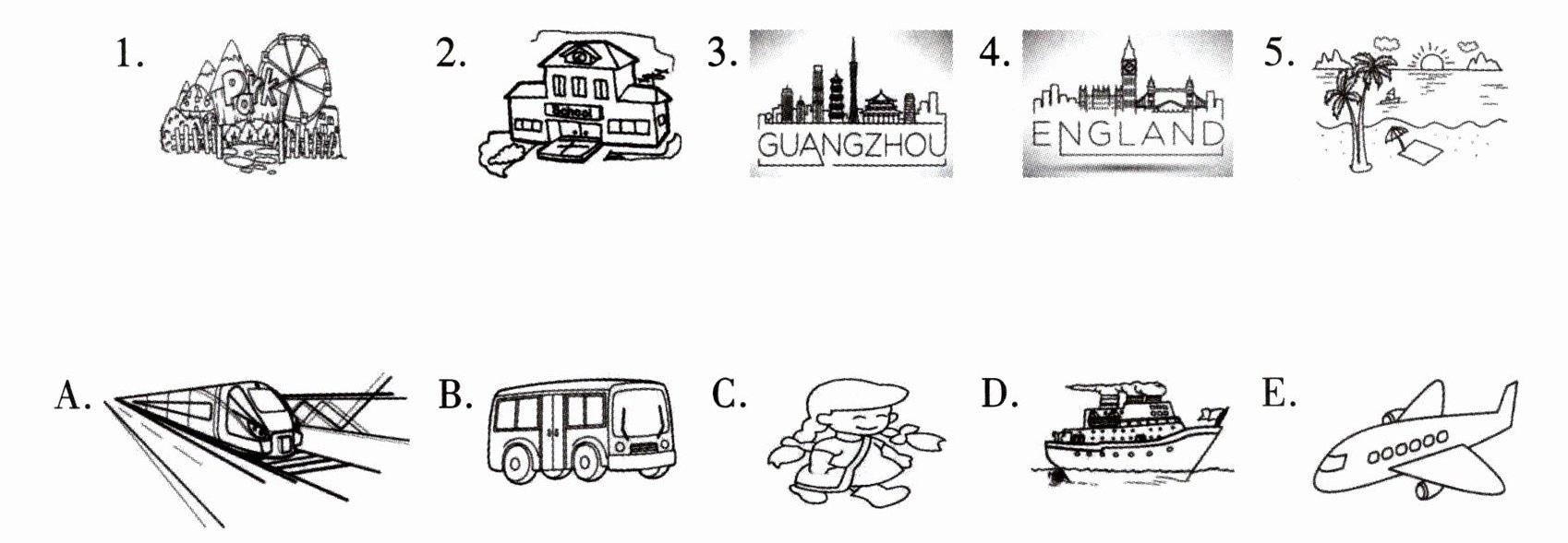 一、Listen and match. 交通工具大调查。请你认真听,将同学们去的地点与乘坐的交通工具连线。