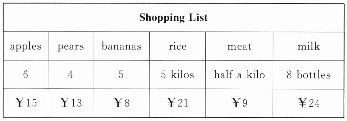 六、周末,Sam 拿着 Mr Smart 给的购物清单去超市购物。他买了些什么呢?根据上下文选择恰当的选项补全对话,将其序号填在横线上。(5 分)