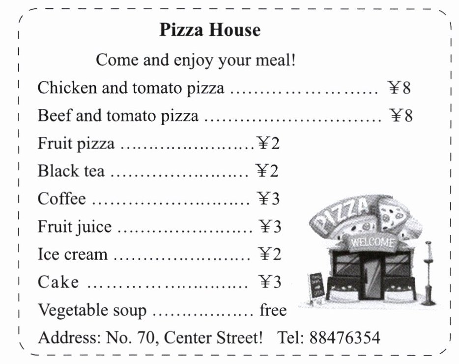 )2. We can’t buy ____ in Pizza House.A. coffee B. milk C. fruit juice
